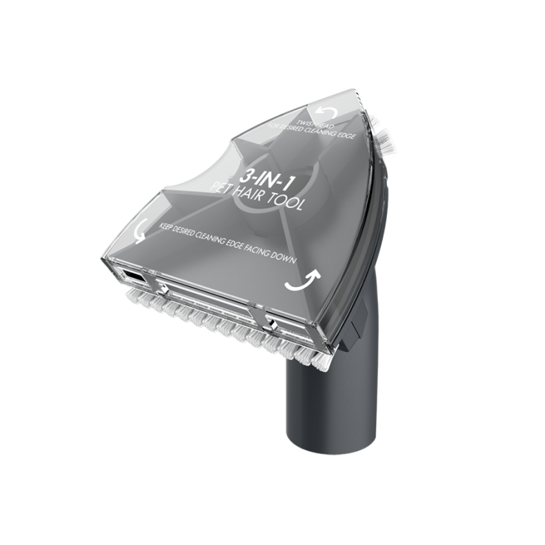 L'accessoire 3-en-1 est idéal pour ramasser les poils d'animaux. Cet outil rotatif doté d'une forme triangulaire et de poils fermes facilitant l'accès dans les coins