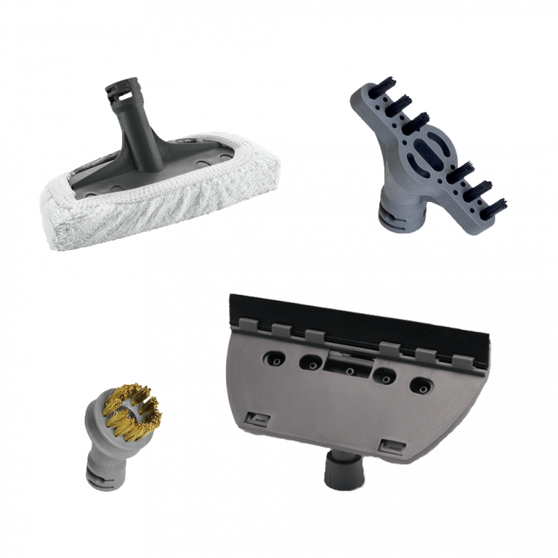 Le Kit d’accessoires PowerFresh LiftOff se compose d’un racloir à vitre, d’un chiffon à vapeur pour tissu, d’un nettoyeur à vapeur pour tissu, d’une brosse pour les raccords et d’une brosse à poils métalliques. Le racloir à vitre entretient vos carreaux à la vapeur, sans détergent, pour un environnement plus sain. Procédez à un repassage express de vos textiles ou rideaux avec le nettoyeur à vapeur pour tissu. Récurez et nettoyez les zones les plus difficiles avec les brosses à poils métalliques et à raccord fournis dans le kit. Chaque produit du kit s’installe et se retire facilement des appareils PowerFresh, LiftOff ou PowerFresh Slim Steam.